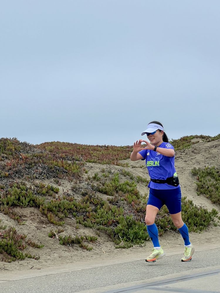 照片3-4: 返回起跑点,即将完成长跑,向先生比心表示感谢。跑步结束后,先生微笑着“毒舌”地说:“你真的是坐月子呀,发福了,看着就像一个小圆球一滚一滚地向前,还滚得挺快的:-)”。面对他的笑里藏刀,我对他翻了个白眼,却无法反驳,因为他说的是实话呀,我坐月子期间增重了:-(;幸好现在出月子了:-)。