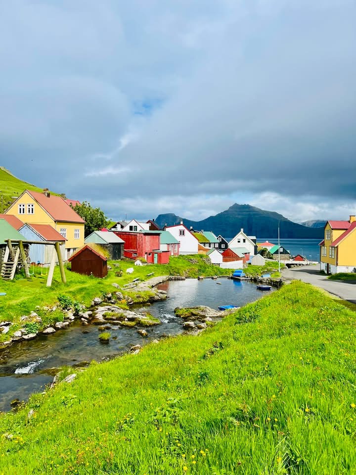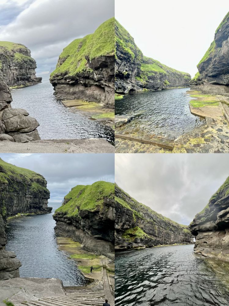 照片4-7: 到达东岛最北端的村庄杰格夫,这是坐落在一片深谷尽头的宁静海边村庄;这个风景如画的偏僻村庄常住人口仅19人。杰格夫在法罗语为“峡谷、海蚀隙”,村庄因一条长660英尺(200米)的峡谷(海蚀隙)而得名,这条峡谷从村庄向北延伸至大海。这条被海水填满的峡谷一直被用作天然港湾,多个世纪以来,村民们将这个天然峡谷用作船只的登陆点,有阶梯从岸边通往峡谷。