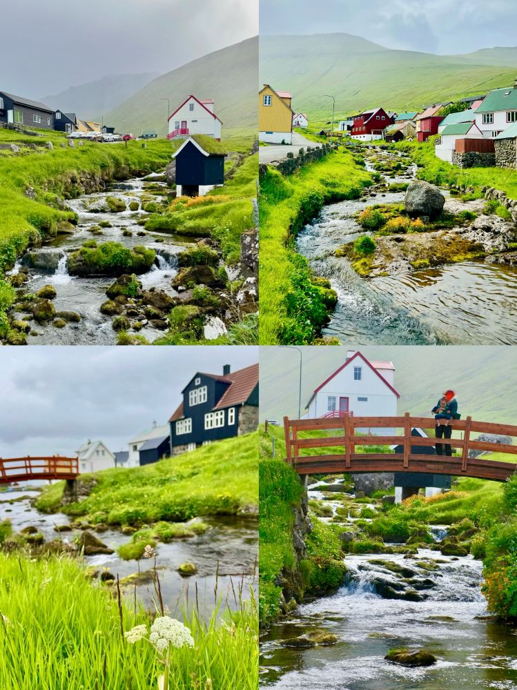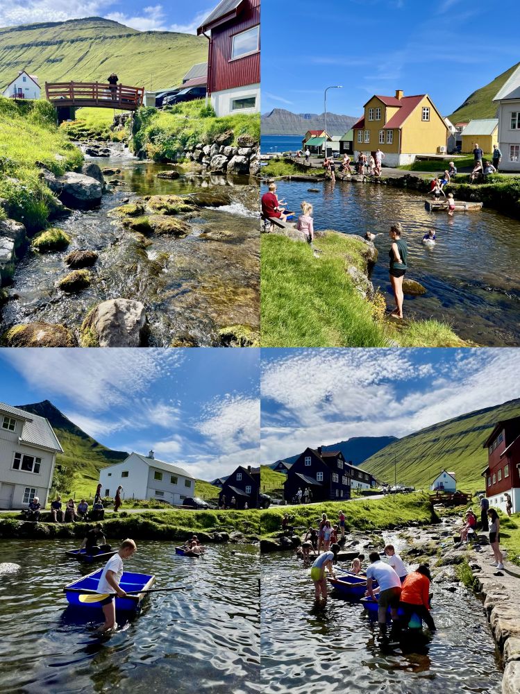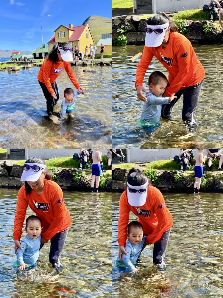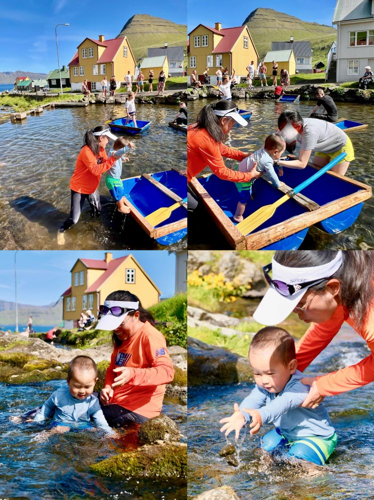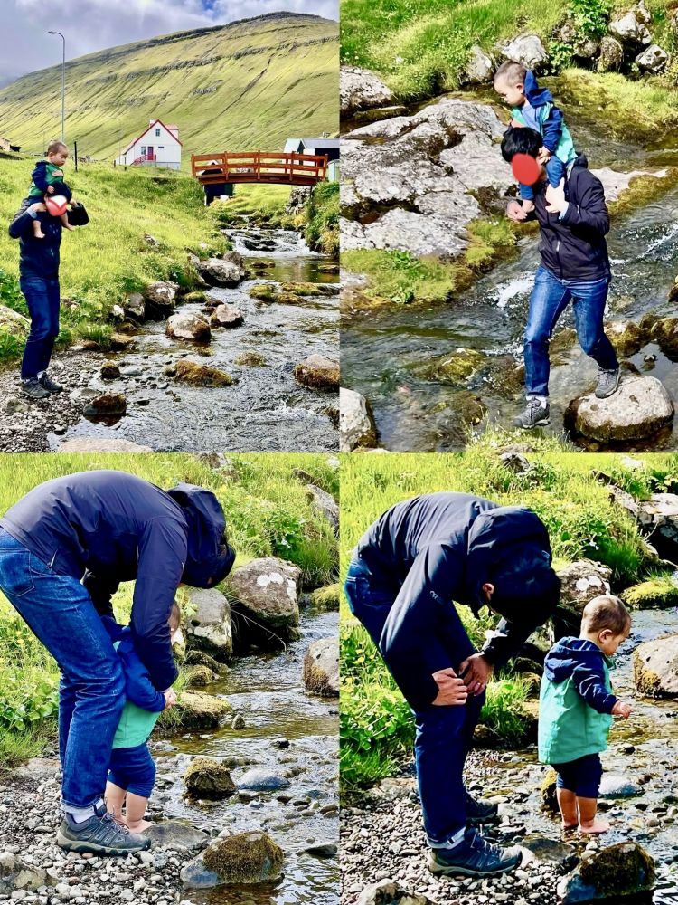 照片17-19: 乡村夏日时光。杰格夫村是法罗群岛著名的度假村,虽然村里常住人口仅19人,但夏天尤其是周末有不少到这里度假的法罗人,当然也有少数象我们家这样的游客。孩子们尽情地在穿越村庄的小溪里玩耍,我们家宝宝也不例外;住在杰格夫村的那3天,我们每天傍晚带宝宝踏入小溪。夏日溪水清凉但不冷,孩子们以多种方式戏水,空气中回荡着他们的欢声笑语。