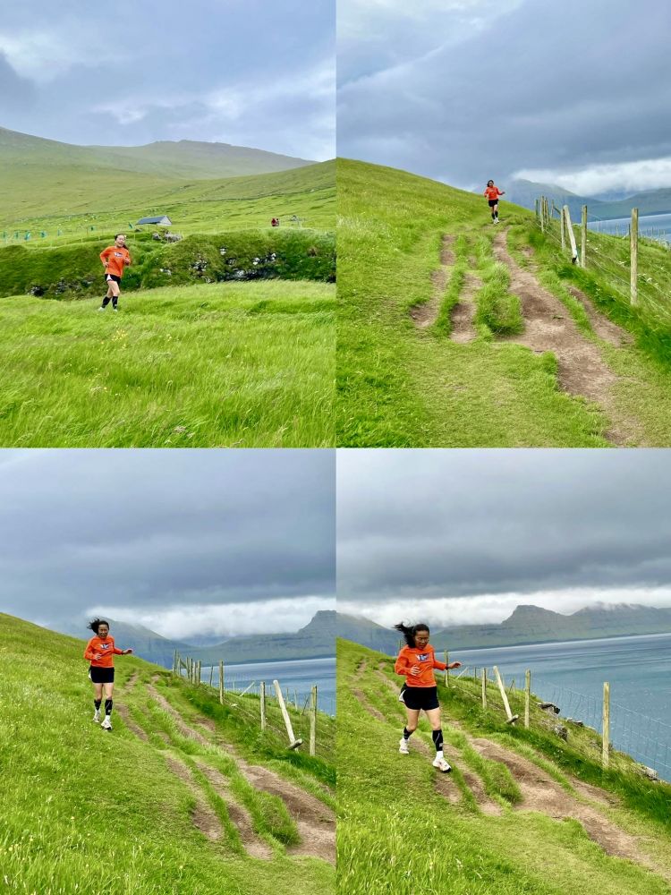 照片14-16: 晚餐后休息了一个多小时,我出去跑了5公里,为争取龙帮跑团举办的“夏日无休跑”活动全勤打卡:-);先生则沿着我的跑步路线悠闲地散步。因为位于北极周边地带,法罗群岛的夏季白昼很长,夜晚很短,所以,晚上9点多钟跑步天依然很亮。虽然环境优美,景色宜人,但高低起伏的山丘地形不适合跑步,更别提海边的强风了;但为了得“夏日无休跑”全勤,住在杰格夫村的3天里,我每天跑5公里为无休跑打卡:-)。