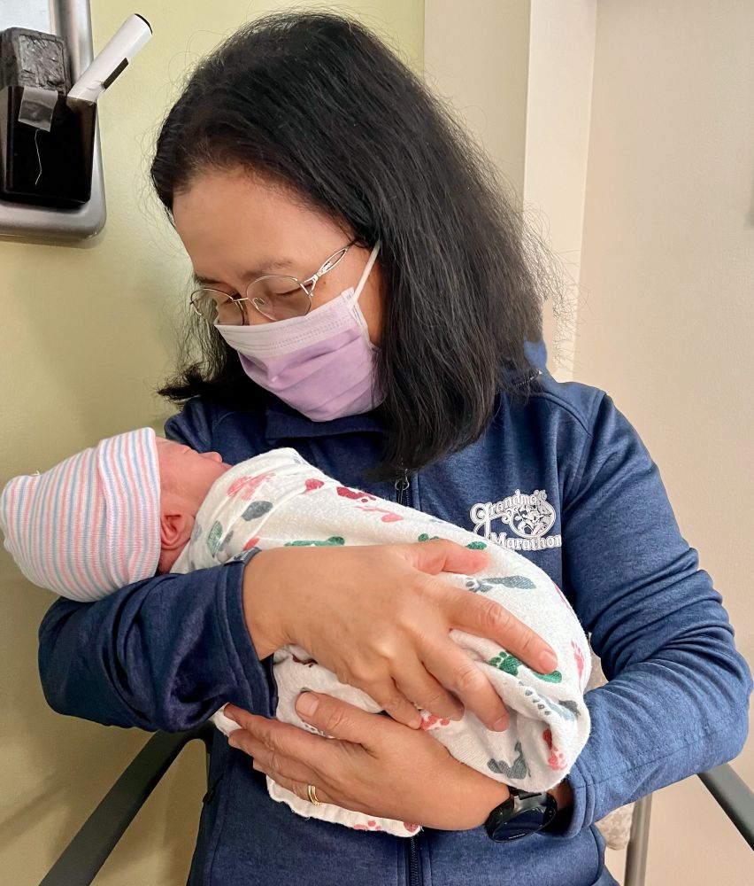 照片1: 外婆初拥刚出生的宝宝入怀。