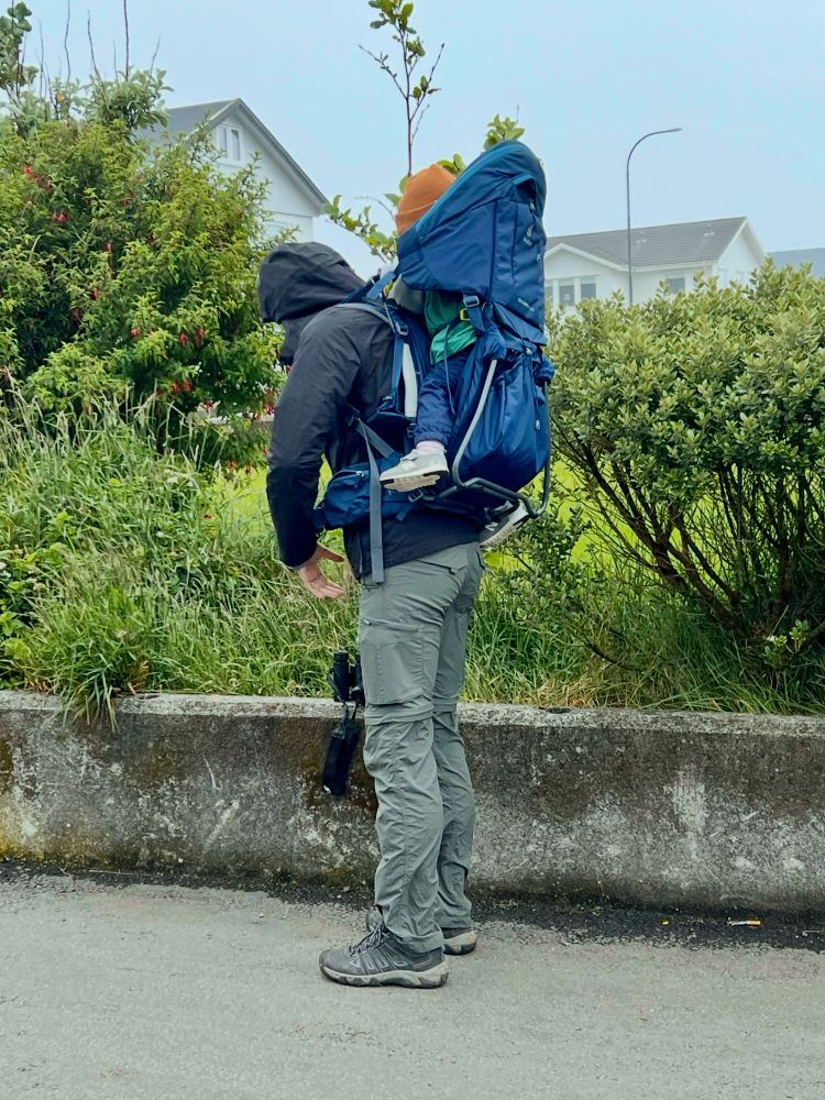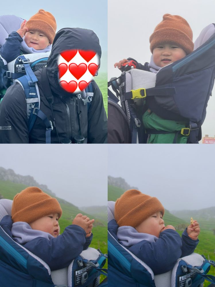 照片11-12: 在爸爸背篓里的宝宝赞同绵羊们的观点,觉得在这样的天气徒步远足也挺傻:-);不过,只要有玩具玩和有点心吃,宝宝照样是开开心心:-)。