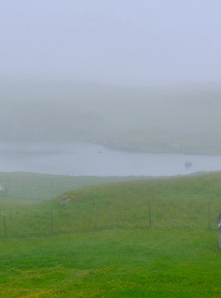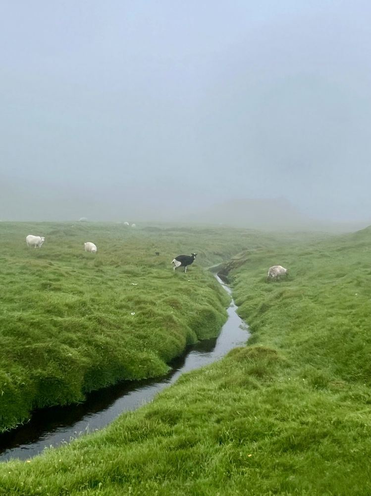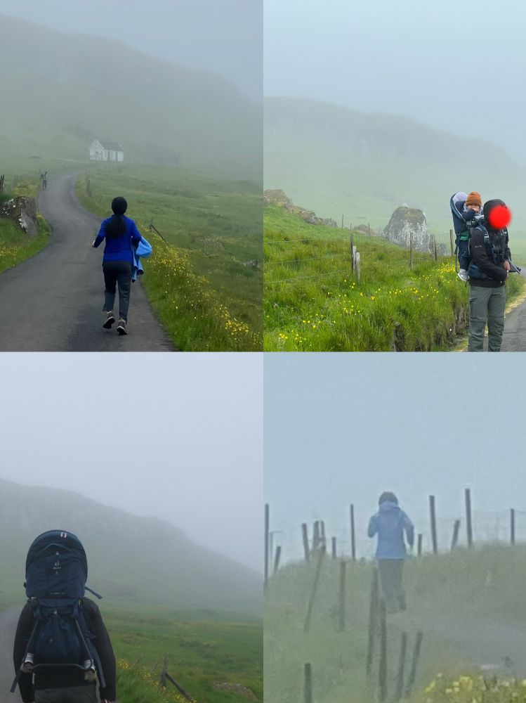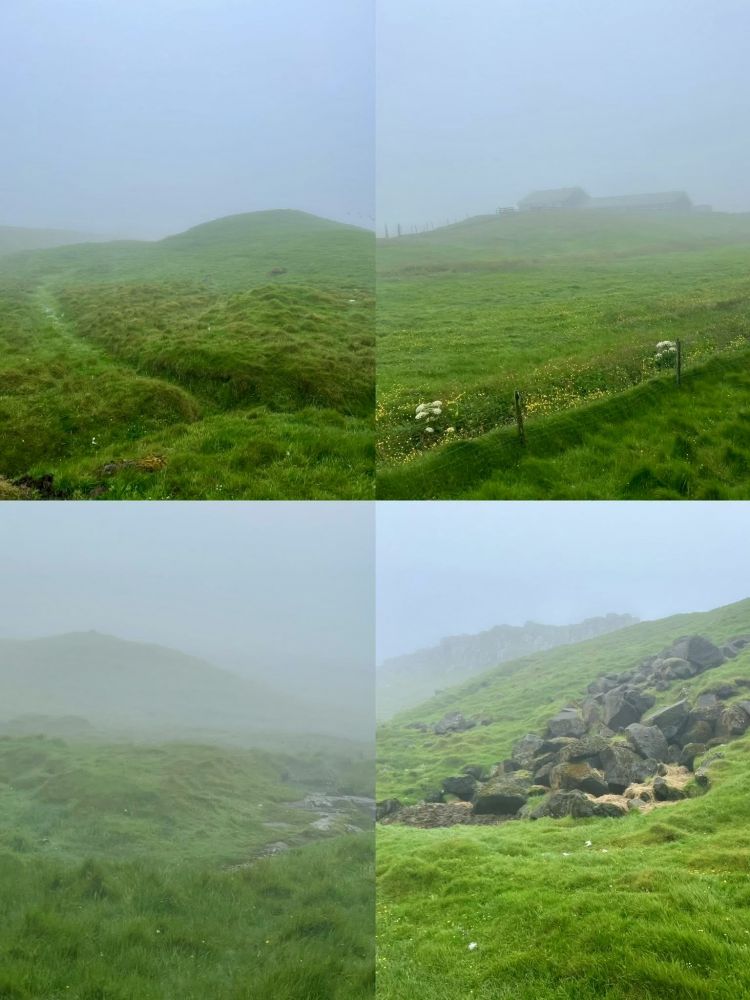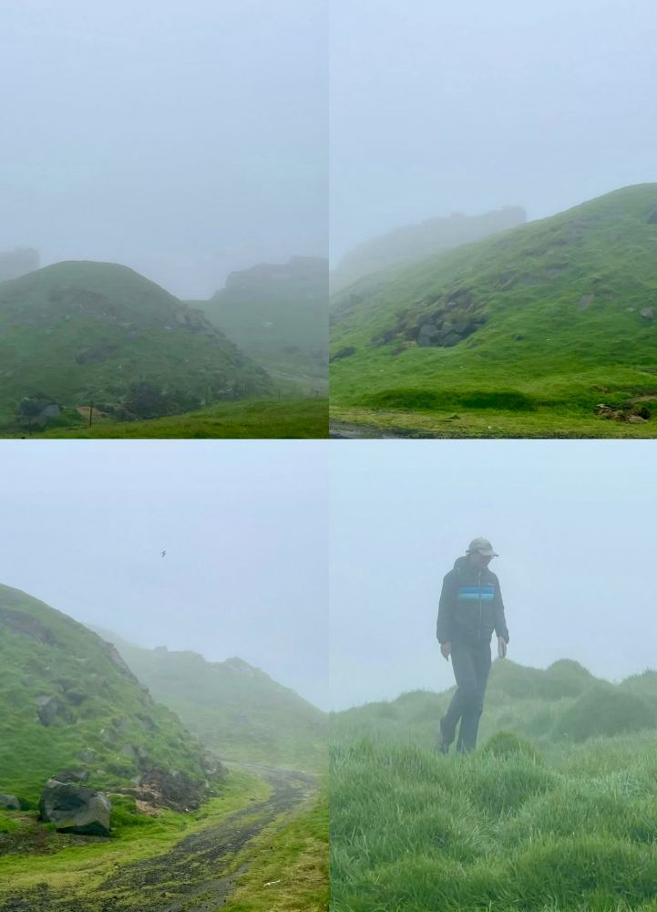 宝宝妈妈按排了这次全家7月份度假半个月的方方面面,吃住行玩都是由她操办,早己从我手中接过了家庭旅行agent的职责:-)。她选择的这条徒步远足线路是一条“野路”,不在AllTrails网站中,而是她在网上阅读了一篇相关英文游记得到的信息。这条“野路”吸引她的原因是人烟烯少,宁静祥和 ,与大自然亲密接触,路道尽头能欣赏到海中悬崖以及“女巫手指”景观。当然,由于天气原因能见度太低,我们没有欣赏到海中景观,但我们全家仍然玩得很开心,在迷雾小雨中徒步远足另有一番意境。注:真是东边不亮西边亮,当我们第7天在法罗群岛的第三大岛屿沃格岛(Vagar)徒步远足时欣赏到了海崖延伸到海中的“女巫手指”。