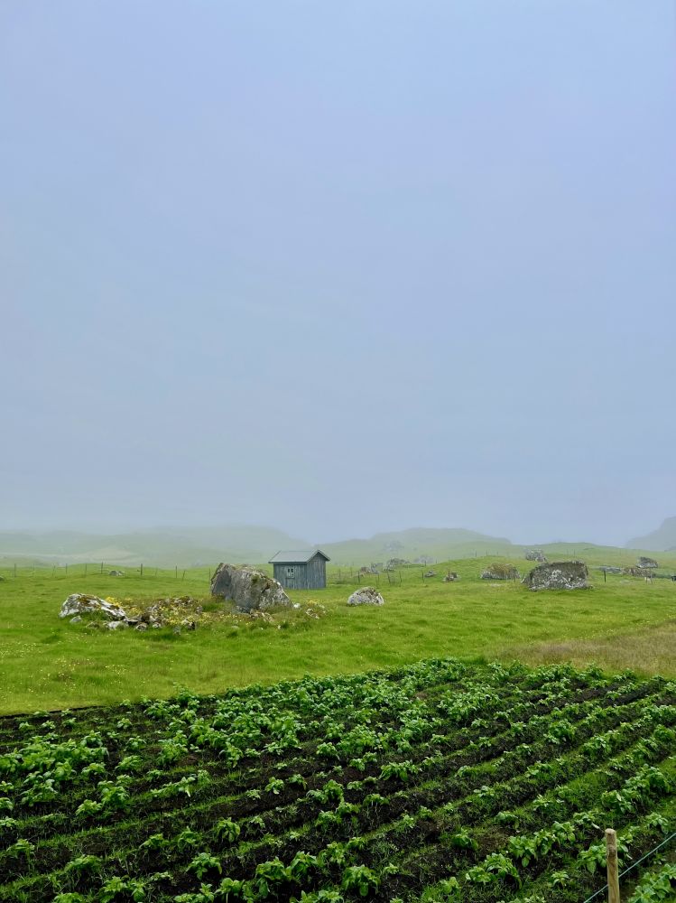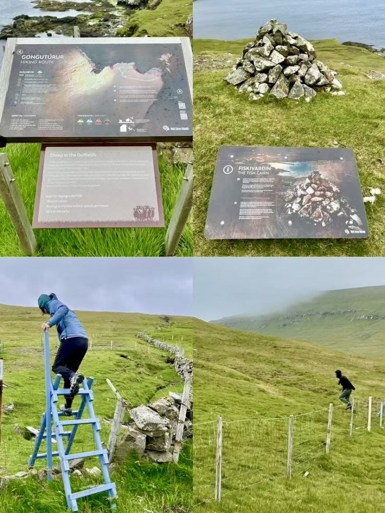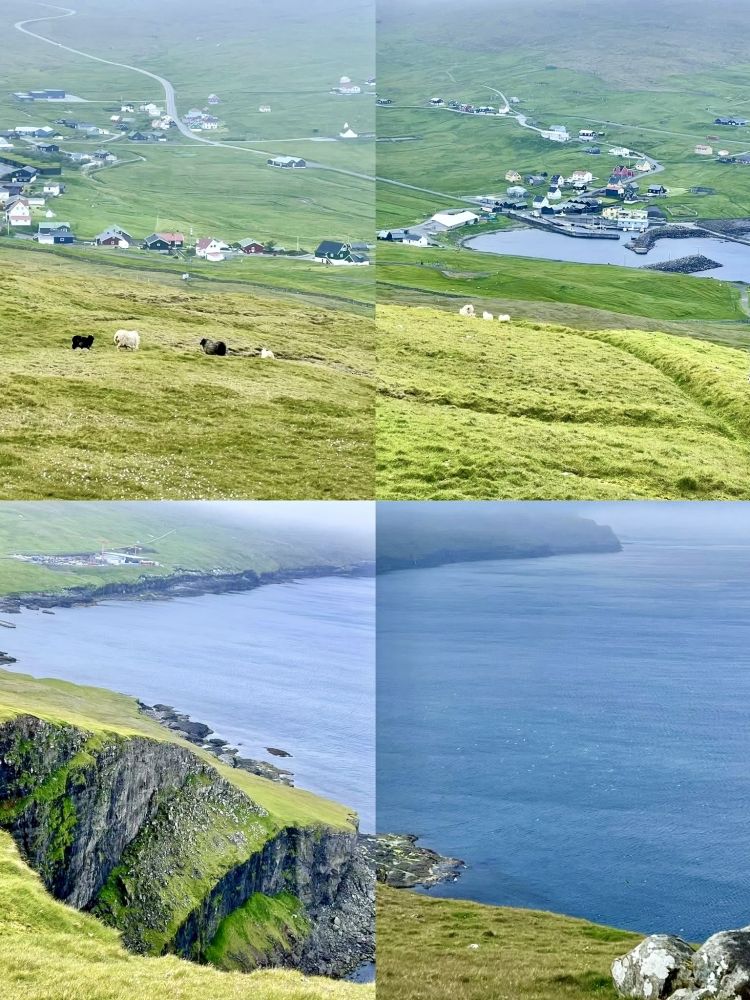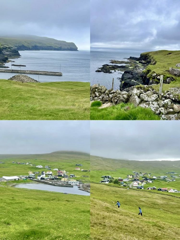 虽然法罗群岛经常下雨,但通常不会持续一整天。在雾蒙蒙的小雨中从桑岛西北海岸的斯科蓬村出发完成了在桑岛的第一条徒步远足线路之后,我们开车前往位于桑岛东海岸的斯卡拉维克村(Skálavík)。在村里的一家海边咖啡馆喝了咖啡和享用了下午茶之后,雨停了,天气放晴,能见度大为改善。从斯卡拉维克村出发,沿着“贡古图鲁尔徒步路线”(GONGUTURUR HIKING ROUTE),在海边大风中,我们圆满完成了在桑岛的第二次徒步远足。
