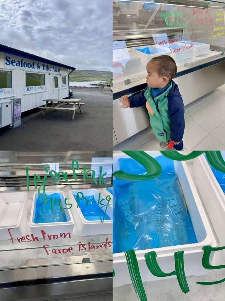 厨艺爱好者与资深美食家宝宝妈妈提前两个月就为家人在法罗群岛唯一的米其林餐馆Paz预订了晚餐;但由于此餐馆不接待儿童,所以,宝宝外公和我与宝宝爸爸妈妈错开在两个不同的晚上前往Paz用餐( 《初访法罗群岛:乡村、泻湖、瀑布、米其林晚餐 》) 。从桑岛途步回到位于位于斯特莱默岛的法罗群岛首府托尔斯港民宿之后,为了解决宝宝外公外婆和宝宝当晚的晚餐(此晚是宝宝爸爸妈妈去Paz用餐),宝宝妈妈推荐了位于东岛(Eysturoy)的一个著名当地新鲜海鲜供应商索盖蒂(Sjogati)的门市店。
