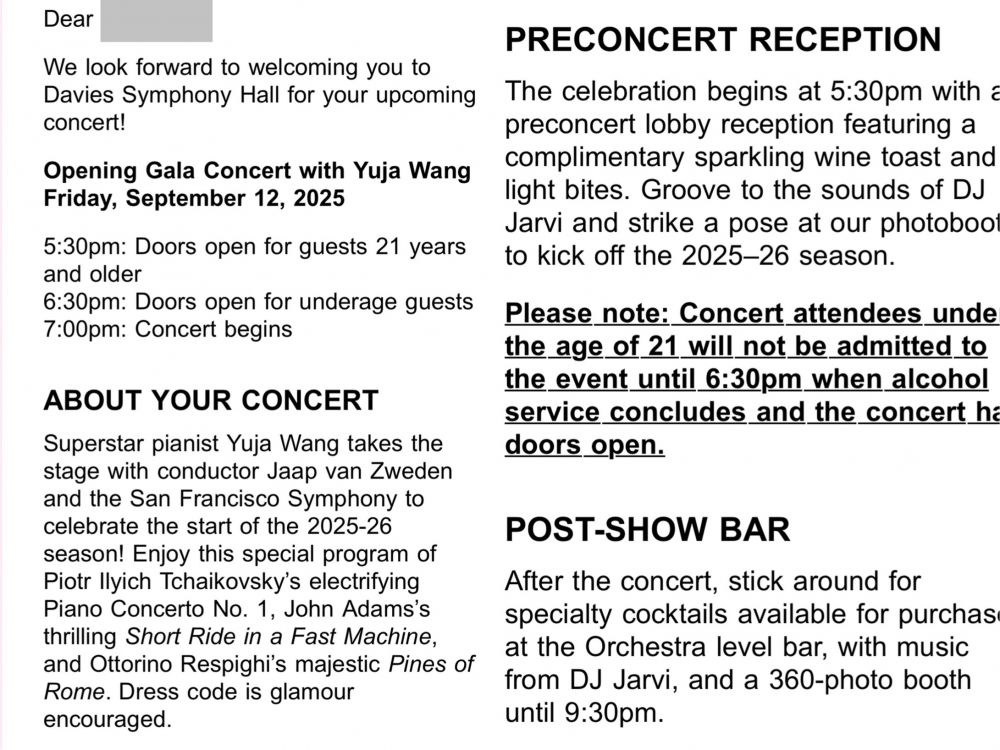 照片2: 38周年结婚纪念日的庆祝包括今晚将前往旧金山音乐大厅(Davies Symphony Hall)观赏聆听旧金山交响乐团的演出,这是我们收到的相关电子邮件。今晚恰好是交响乐团2025-26音乐会季开幕晚会庆典,我们购买的相关入场票包括音乐会开始前的鸡尾酒会,有与当晚的音乐演奏家和指挥家交流的机会;音乐会结束后,还可以继续留下参加相关晚会。