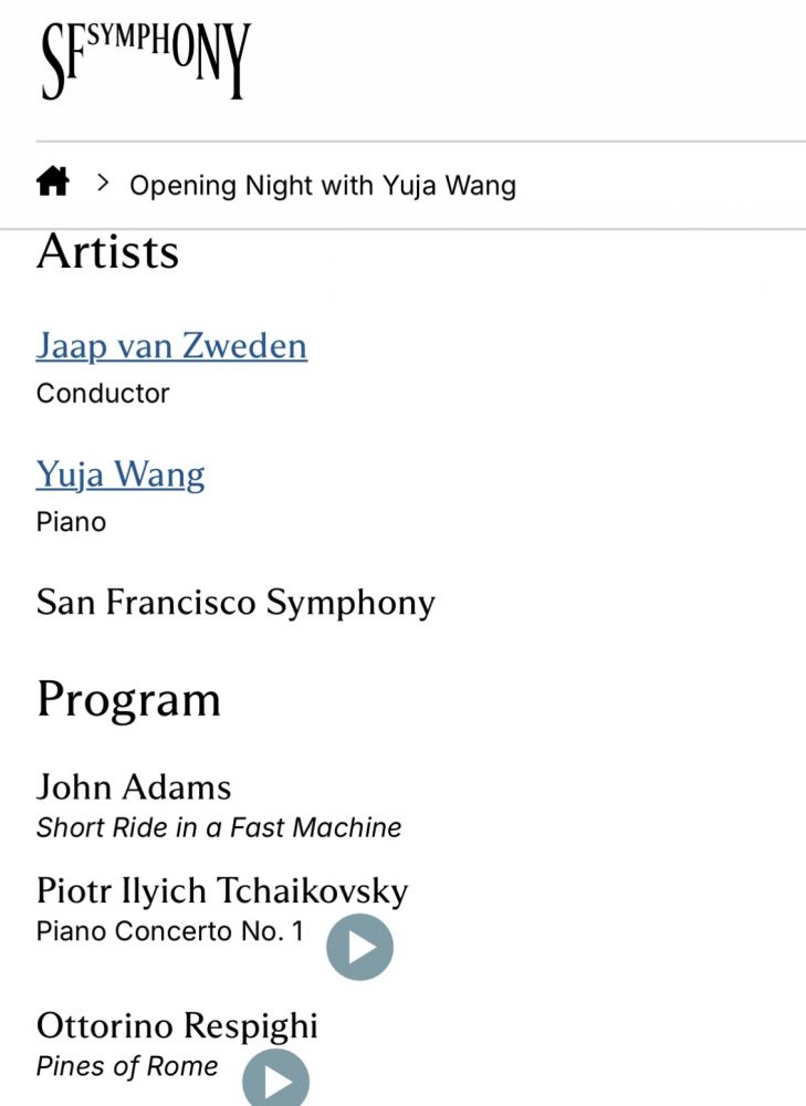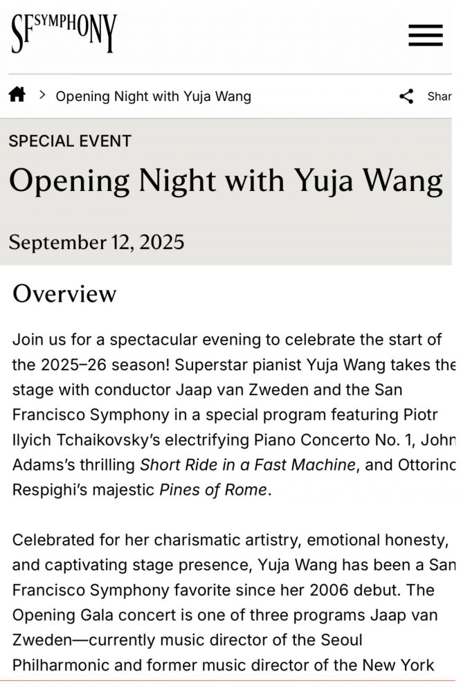 照片3-4: 旧金山交响乐团官网上展示的2025-26音乐会季开幕晚会庆典音乐会演奏的曲目非常精彩吸引人,是我们很喜欢的世界著名作曲家们创作的名曲,其中包括世界著名的俄罗斯作曲家柴可夫斯基(Piotr Ilyich Tchaikovsky)的《第一钢琴协奏曲》(Piano Concerto No. 1)、美国当代古典音乐作曲家,简约主义音乐代表人物之一亚当斯(John Adams)的乐队曲《快机器上的短旅程》(Short Ride in a Fast Machine)、以及融合了印象派和新古典主义风格的意大利作曲家奥托里诺·雷斯皮吉(Ottorino Respighi)的交响诗《罗马的松树》(Pines of Rome)。今晚的交响乐团2025-26音乐会季开幕晚会庆典票价较为昂贵,不仅是因为演出节目精彩,更主要的是今晚柴可夫斯基《第一钢琴协奏曲》的演奏者是世界著名的美籍华商钢琴演奏家王羽佳(Yuja Wang),今晚音乐会的指挥家是荷兰指挥家和小提琴家雅普·梵志登(Jaap van Zweden)。非常感谢先生购买的相关音乐会票在我们结婚38周年的当天亲临现场聆听我最喜欢的钢琴协奏曲之一柴可夫斯基的《第一钢琴协奏曲》,并且亲临现场观赏久仰大名的美籍华商钢琴演奏家王羽佳的演奏。交响乐团官网上介绍“王羽佳以其超凡的艺术造诣、真挚的情感和令人沉醉的舞台表现力而闻名,自2006年首次亮相以来,一直是旧金山交响乐团特别欣赏的钢琴演奏家。”