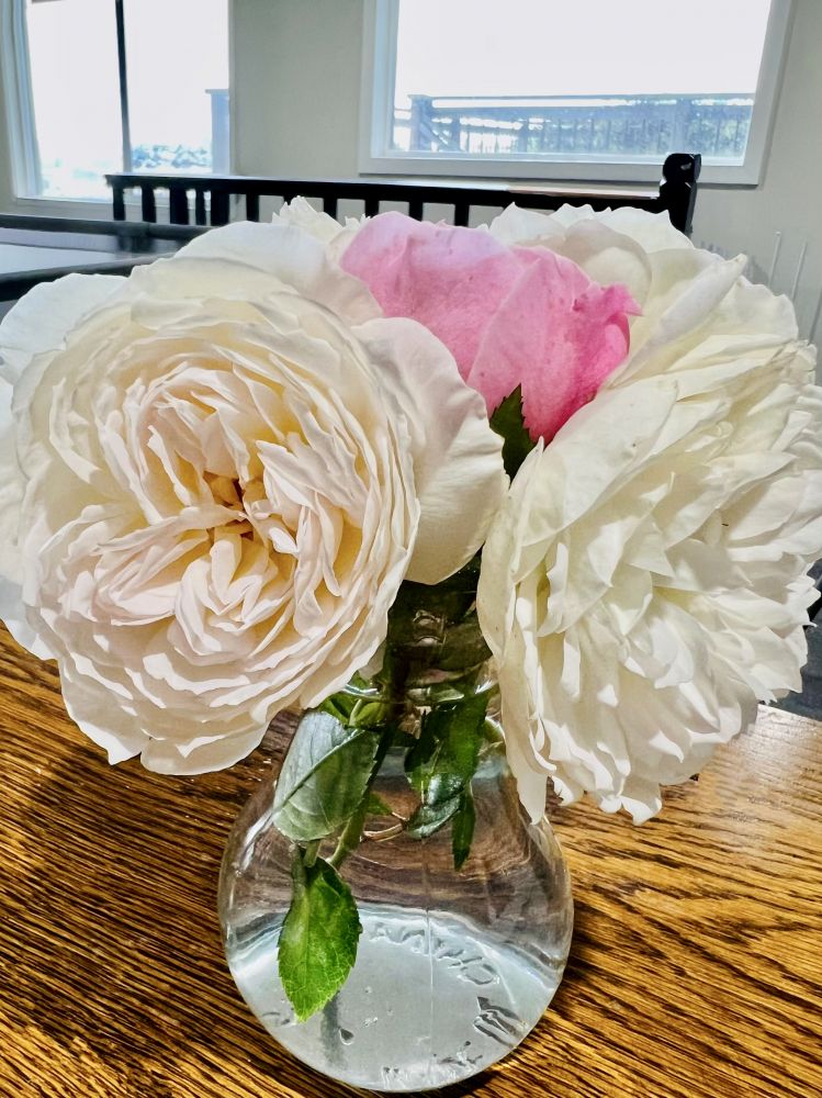 (Godiva)心型巧克力;我也送给先生他心仪的礼物,互祝结婚38周年快乐。我一眼就认出了这次先生送的玫瑰花不象往年那样购买的,而是来自女儿小花园里她种的英国玫瑰和冰玫瑰。看着先生送的玫瑰花和两颗心型巧克力,我开玩笑说“真小气”:-)。先生回答“错!我可不是小气,两张开幕晚会的票能买好几百朵玫瑰花。我这是礼轻情谊重。在商店里不容易找到象女儿种的这些玫瑰花。白色的冰玫瑰代表我们初相识、初恋、以及至今38年的纯真爱情,英国玫瑰代表我们38年婚姻生活初期在英国留学的重要篇章。送你喜欢的心型巧克力代表我们的婚姻甜甜蜜蜜;只给你两颗是为了你好,因为你对喜欢吃的东西缺乏自控力,所以,每隔两天给你两颗。”听着先生的“狡辩”解释,我笑着说“俗话说会讲甜言蜜语的男人通常是做了亏心事,非奸即诈!不过,我还是要谢谢你送的礼物和好意”:-)。