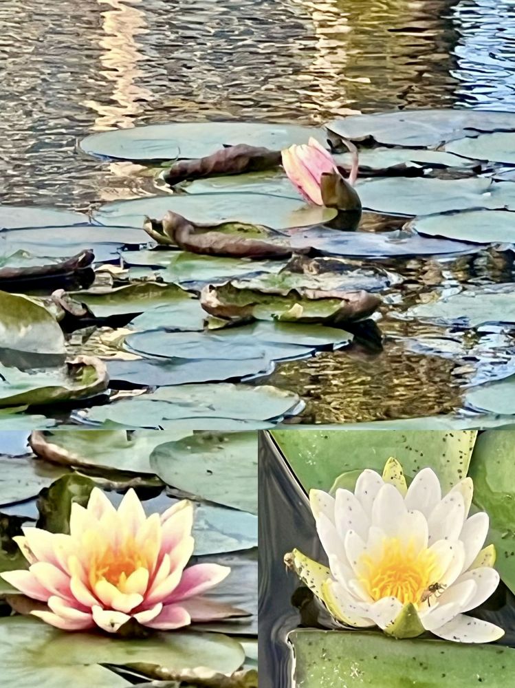 照片15-16: 水中残荷与依然绽放的睡莲。