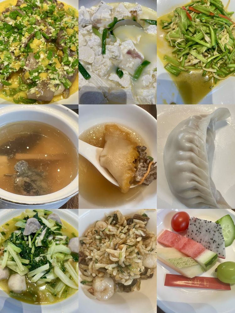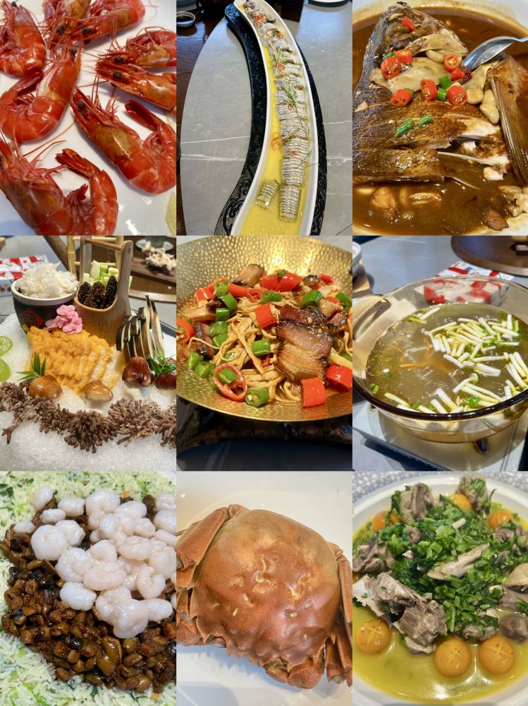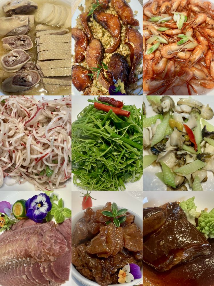 照片2-4:聚会时品尝的一部分锦春大酒店美味佳肴,既有传统的淮扬菜,又有创新的独家菜,色香味俱佳,使品尝者口中留香。聚会时把酒言欢。不过,同学们喝的是真酒,而从不喝酒的我喝的是水:-)。
