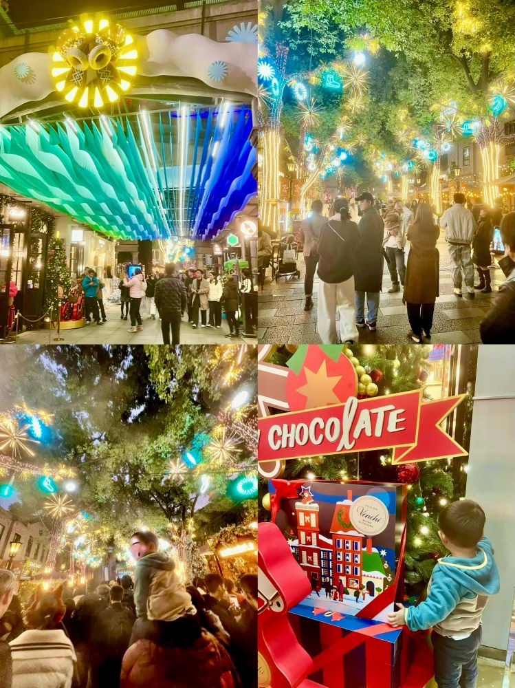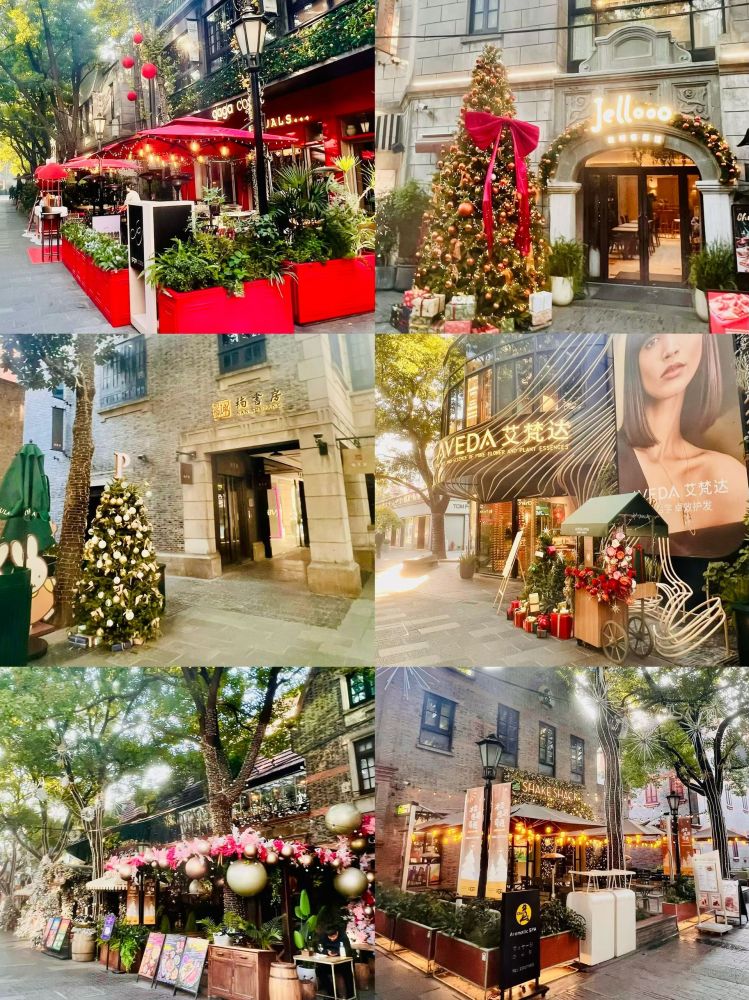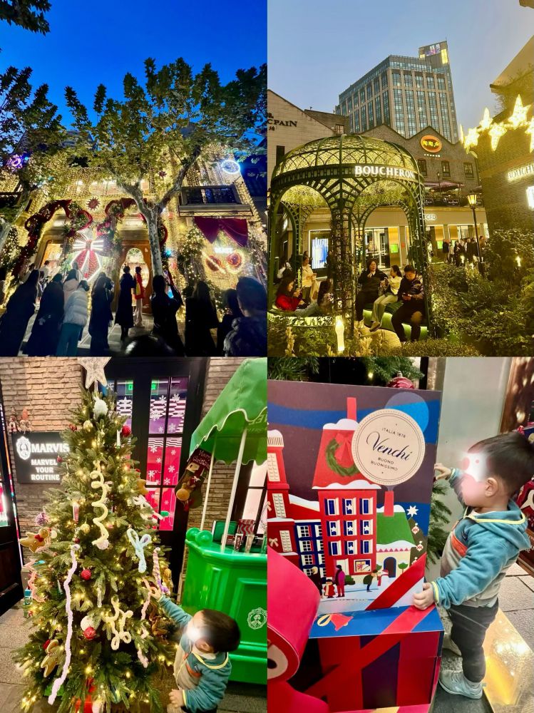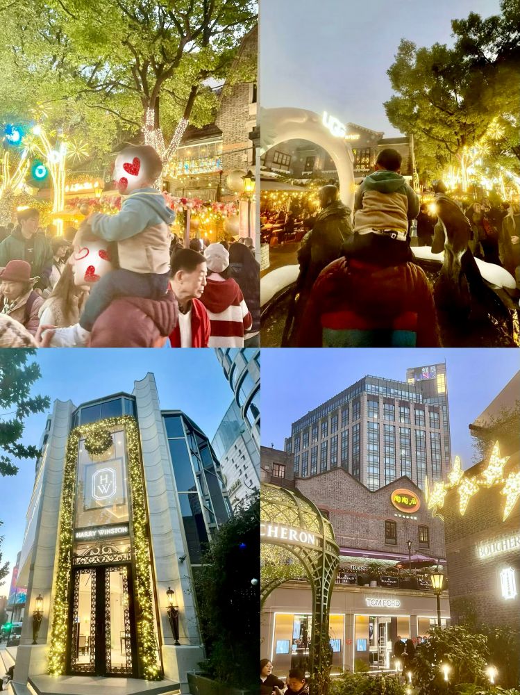 照片3-5: 12月中上旬的一个周六黄昏和夜晚,新天地人潮涌动,尤其是在具有现代时尚元素的新天地南里(South Block),汇集了许多国际品牌精品店、多种特色餐厅、时尚酒吧、咖啡馆、以及艺廊。不少商家己经有圣诞装饰,漫步其中,我们感受到浓郁的节日气氛,上海不愧为一个国际大都市。