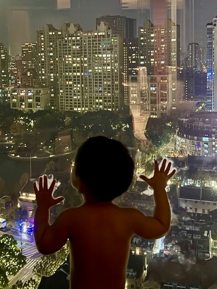 照片1: 新天地朗廷酒店地理位置独特,被称之为新天地门户之一,我们家两个高层景观商务套房相邻,皆有能观赏到新天地全景的大窗。注:宝宝逐渐长大了,宝宝妈妈开始限制宝宝外婆在网络使用宝宝正面照,外婆遵守指令:-)。