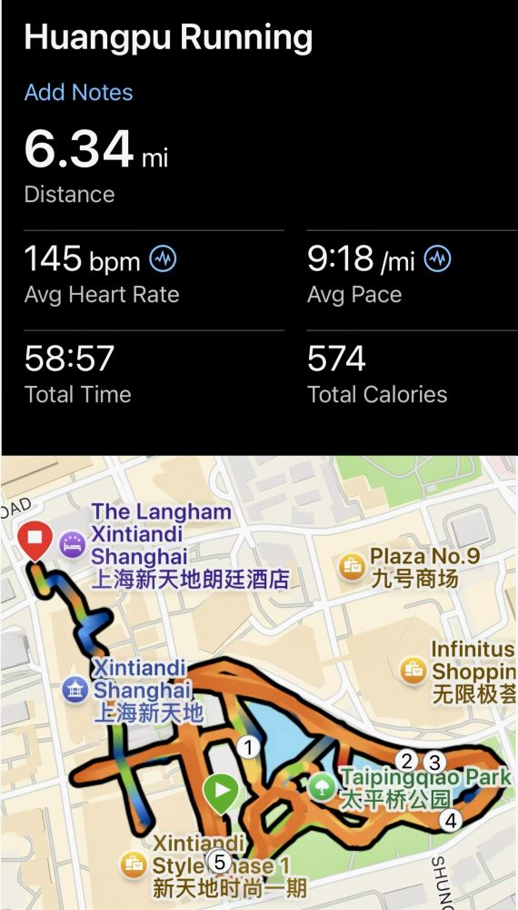 照片17: 手表记录早晨7点49分从朗廷酒店出发起跑,在新天地里的街巷奔跑,包括在新天地里的太平桥公园绕圈,跑了6.34英里(10.21公里)。