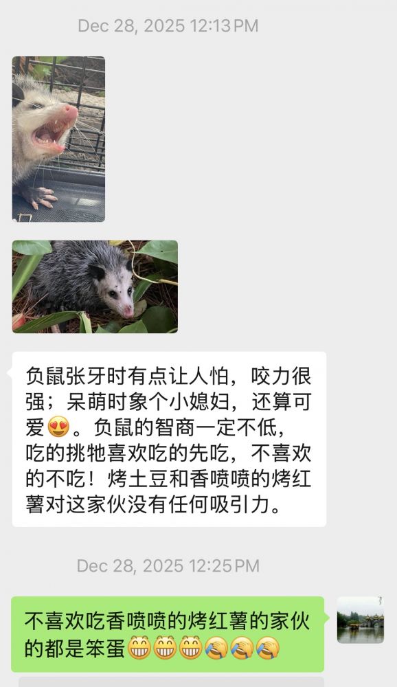 谢谢新朋友。是啊,我的那位捉了负鼠的朋友以及不少网友在论坛留言说负鼠挺聪明,负鼠的一大本领是遇到危险时会装死:-)。