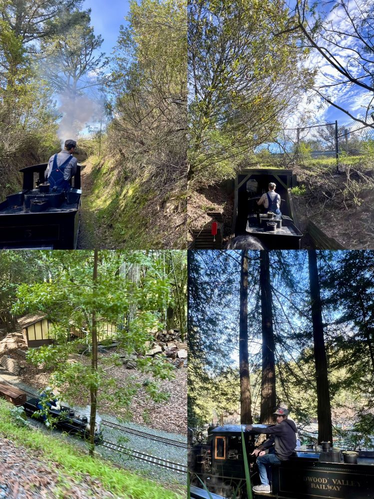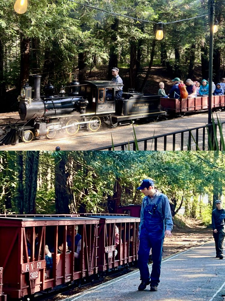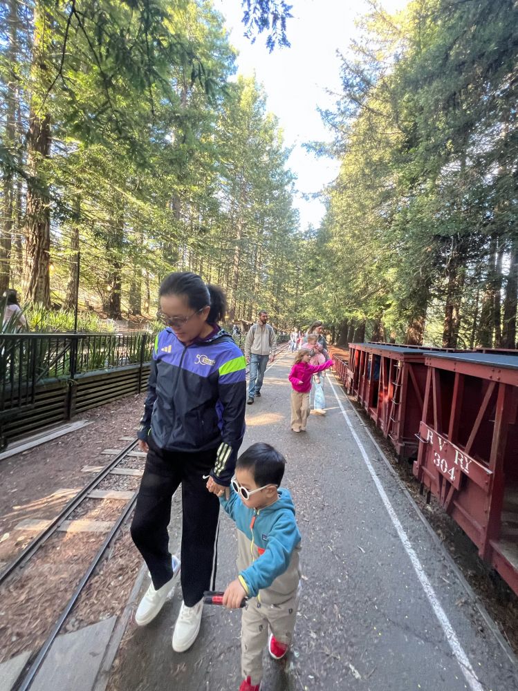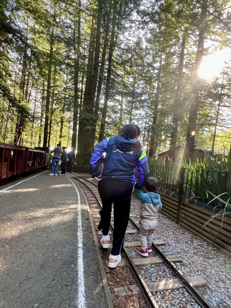 2. 乘小火车与享受美食 星期天,我们全家前往位于旧金山海湾东湾的伯克利(Berkeley )著名景点蒂尔登区域公园 (Tilden Regional Park )游玩。这座占地超过2000英亩公园坐落在伯克利山和圣巴布罗岭之间,提供一系列休闲活动,例如徒步、野餐、蒸汽火车、旋转木马、小农场、植物园等等。我们家宝宝特别喜欢乘坐火车和玩火车模型玩具,家里有二十多辆大小不一、形状不同的火车模型以及多套火车轨道系统(他父母购买的以及亲友们赠送的礼物),每天从托儿所放学回家“开火车”,乐此不疲。因此,全家到达蒂尔登区域公园之后,首当其冲地前往乘坐红木谷铁路(Redwood Valley Railway)的蒸汽小火车,在公园红木谷森林中穿行。。。