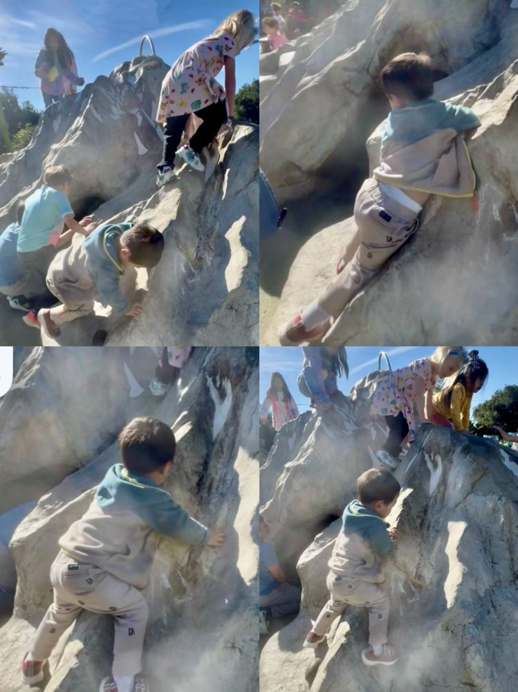 照片16-17: 宝宝玩得尤其开心地是在动物园里的儿童天地区域,刚开始他是老老实实地沿着台阶爬行登高,很快就跟着大孩子们走“歪门斜道”攀“岩”。这群大小不一孩子们的行为和欢声笑语仿佛成了动物园里的参展动物:-),?外赏心悦目。