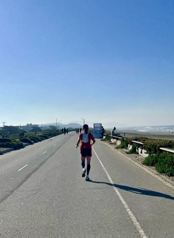 照片2: 为了节省时间,我没有象以往那样跑前站石与大海合影,并且比预计的时间提前返回原点,在大约15英里处见到漫步的先生,他只抓拍到我奔跑的背影:-)。