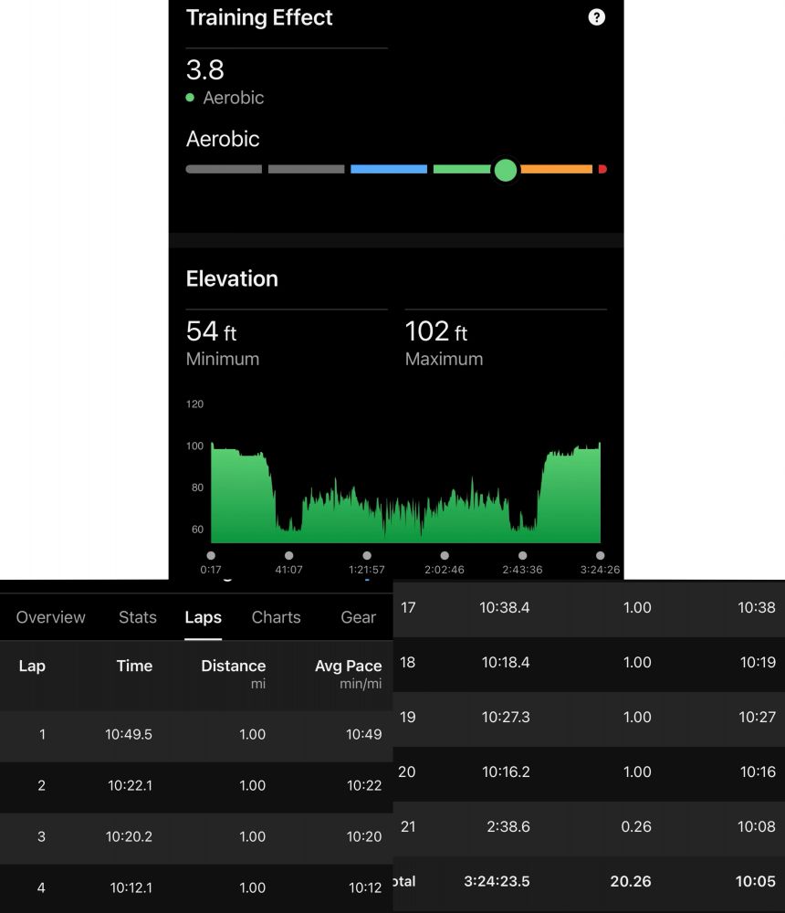 照片11: 很感恩愉快地跑完了20.26英里,起始4英里配速较慢,5至16英里配速旨是sub10,最后4英里配速下降,但并不严重,与起始4英里相似。跑得比我想像的顺利,除了得益于比较平坦的步道,还有平时打太极拳和跳健身操的习惯,尽管跑步很少,但其它运动健身方式帮助保持了体能。不过,这次跑步也是我切身感受到增加的N磅体重对跑步的影响;今年春天有一场赛事,希望能在参赛之前减掉这些体重。