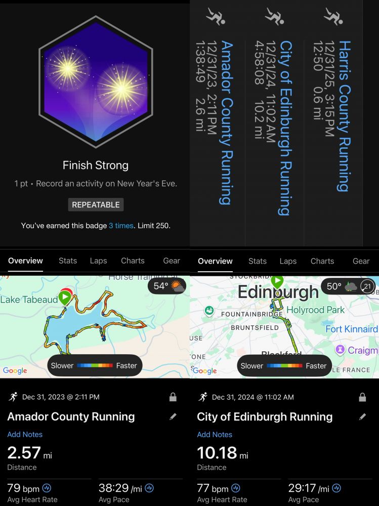 照片7: 2025最后一天的运动得到Garmin(佳明表)发的一枚虚拟奖章(照片7a)并且收到提醒我有3枚类似奖章(照片7b)。出于好奇,我点了3枚奖章的连接,另外两枚是我分别在2023年和2024年的最后一天运动得到的,皆是在外出旅行度假的途中(照片7c-7d);争取将来每年的最后一天都得一枚虚拟运动奖章:-)。