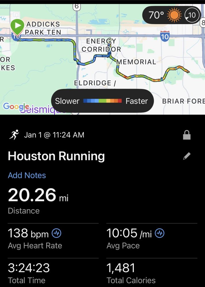 我家邻近两个大公园,分别是占地大约8000英亩的布什公园(George Bush Park)和占地大约500英亩的赫尔希公园(Terry Hershey Park);前者有一条12英里的步道(骑行、跑步、徒步专用),后者有一条10英里的步道,相连共22英里。我通常使用布什公园的步道,但从我家跑到步道终点只有大约9英里,来回大约18英里;如果使用这条步道,大概率我不会完成剩下的大约2英里。因此,我决定朝向赫尔希公园步道跑,跑10.13英里时折返,因为跑出去了,必须跑回家,别无选择:-)。