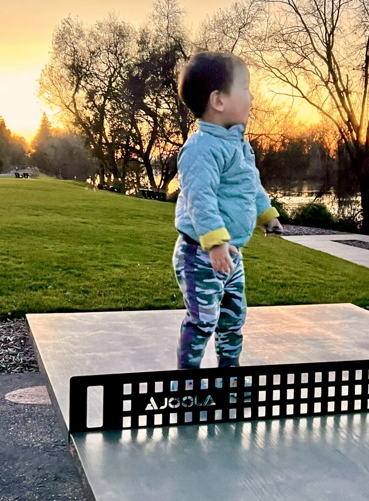 照片11-12: 我们全家在酒店河边观赏晚霞、夕阳、落日,宝宝调皮地爬上了一张户外休闲运动桌。