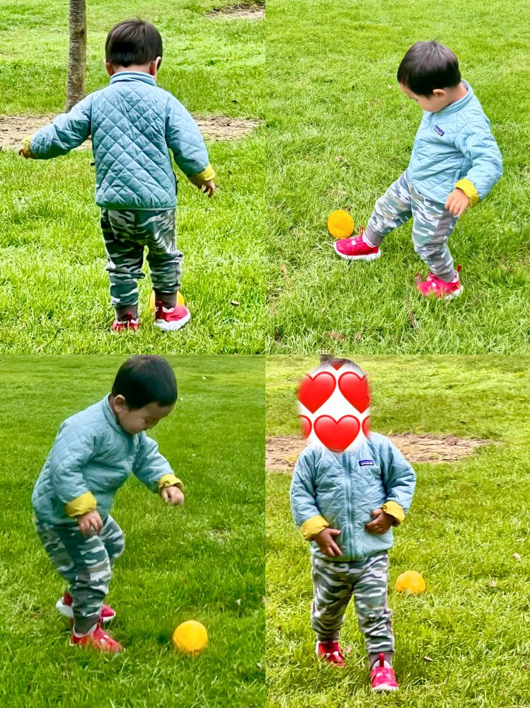 照片14: 宝宝将落在树根草地上的桔子当成球踢:-)。