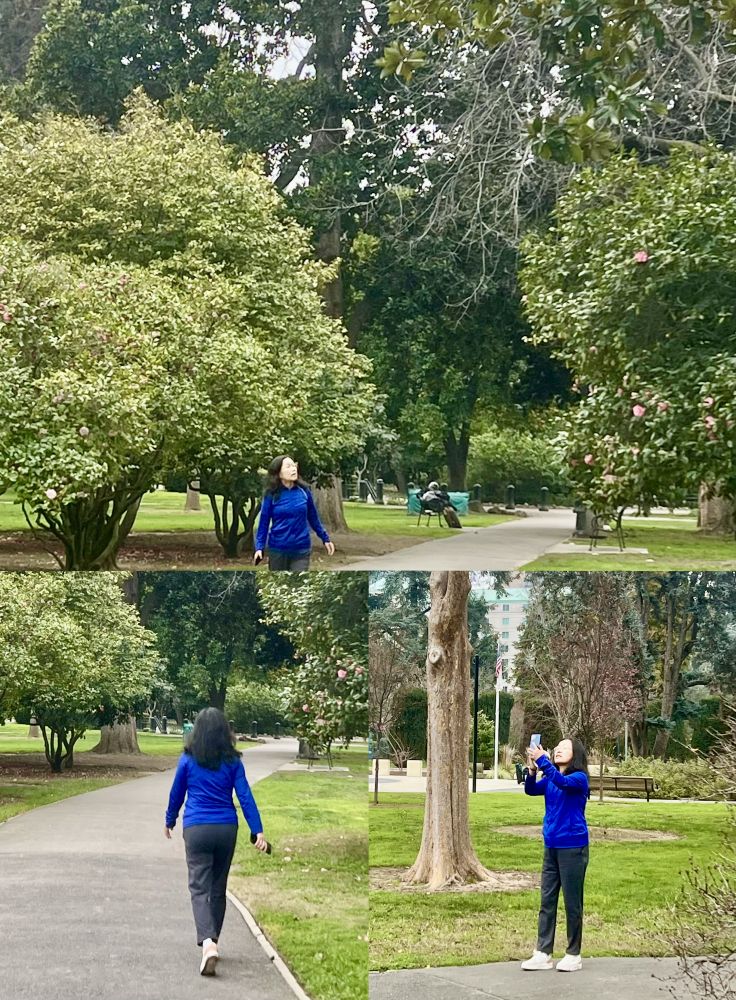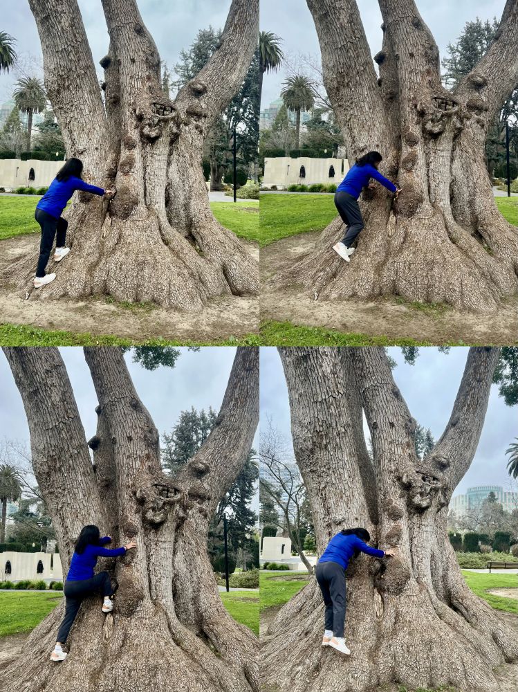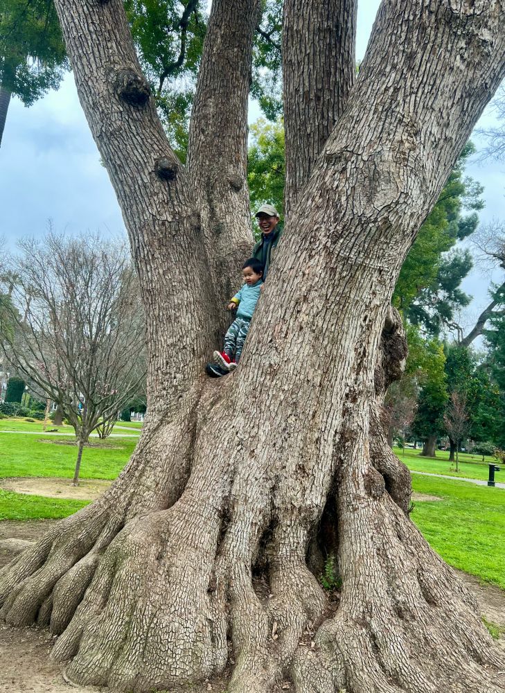 照片15: 在公园里见到有人玩耍试爬一棵粗壮分叉的大树,那人没有成功,但激发了我的好奇,我也试着爬了,但也没有成功:-)。大树分叉看上去不是太高,爬上去似乎不难;然而,真正试了才知并不容易,需要手臂、核心、双腿都强有力。