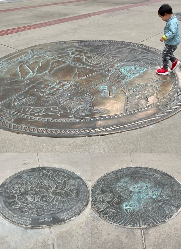 照片5: 议会大厦前的地面上有三个巨大青铜图章,其中包括加州州徽 (The Great Seal,照片5a)。据相关介绍,州徽图案有罗马神话中象征智慧和勇敢的女神密涅瓦 (Minerva);她的脚边是象征着独立和力量的加州灰熊;背景有葡萄园、麦穗、矿工、河流、以及内华达山脉,象征加州的农业、工业、矿产等自然资源,航行帆船则象征着加州与外界的贸易;州徽上写有希腊语“Eureka”(我发现了它),代表加州发现金矿的历史。