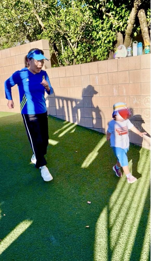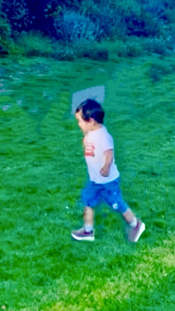 照片5: 抓回来,重新开始起跑,宝宝依然领先:-),祖孙俩居然步伐一致:-)。这是从宝宝外公拍的视频截图,谢谢外公的跟拍。