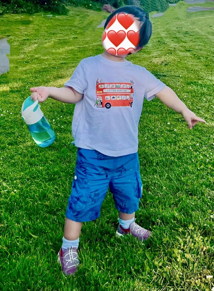 照片3: 吃完水果点心,宝宝坚持自己拿他的水瓶(一大瓶新装的水)要婆婆(即外婆,南方方言之一)与他一起在大草坪上奔跑玩耍:-)。