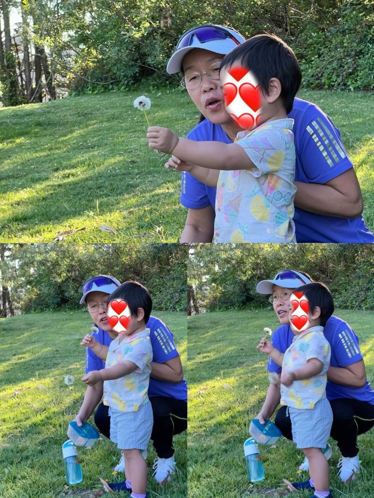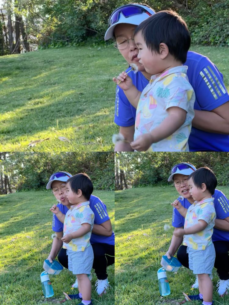 照片2-4: 昨天从托儿所接宝宝放学,祖孙俩玩吹散蒲公英的种子,童趣的传承:-)。