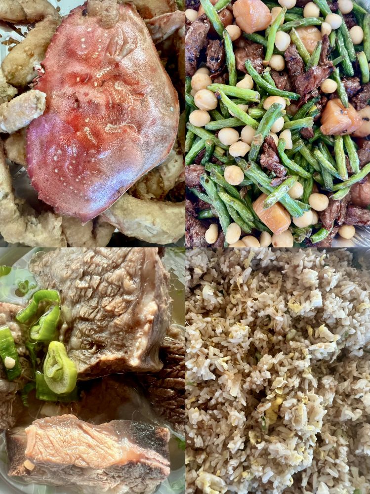 女儿女婿原本计划周五去旧金山著名的岭南小馆(R&G Lounge)吃晚餐庆祝我的康复,但由于此餐馆生意火爆,当天没能预订上我们要的时间段,于是将去餐馆堂吃改为外卖,由DoorDash亲自送货上门。他们点了岭南小馆的特色招牌菜椒盐焗大蟹(珍宝蟹)、夏果带子牛柳(夏威夷果、海贝、牛肉、豆角)、清汤牛腩煲(白萝卜、牛肉)、金双蛋炒饭。吃的时候觉得这些饭菜味道还行,但油和盐都偏多了一些,感觉比我们以前去岭南小馆现场堂吃稍逊一些:-(。