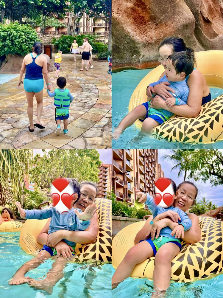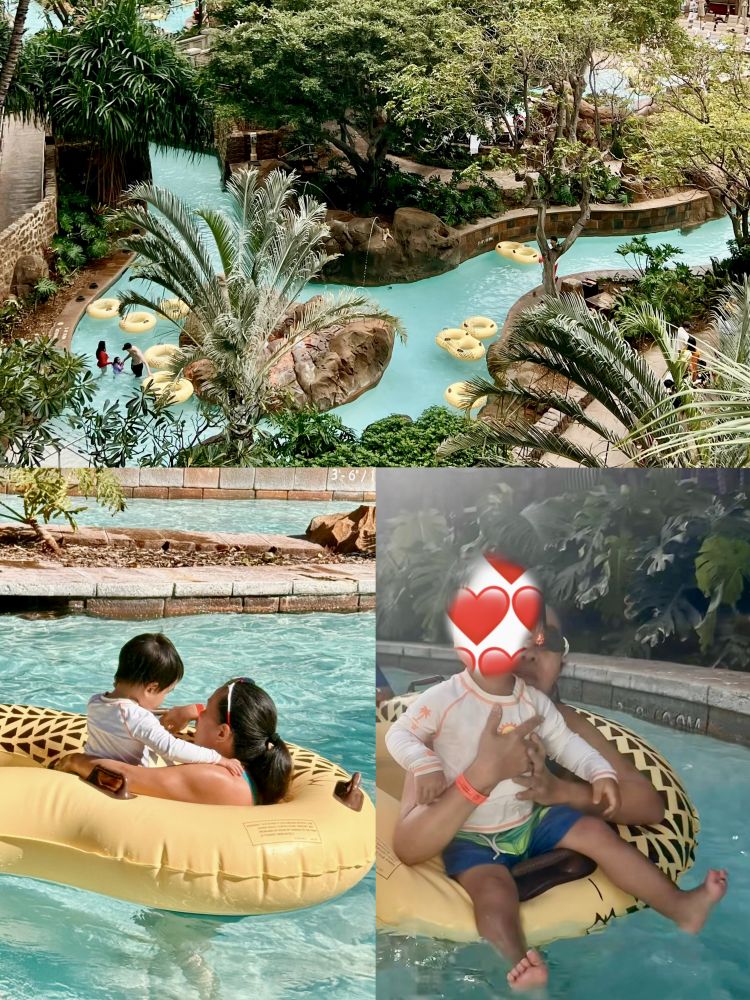 照片3-4: 宝宝最喜欢的是在度假村里的懒人河中漂浮,也是乐此不疲,每天玩好几次,包括在元宵节:-)。