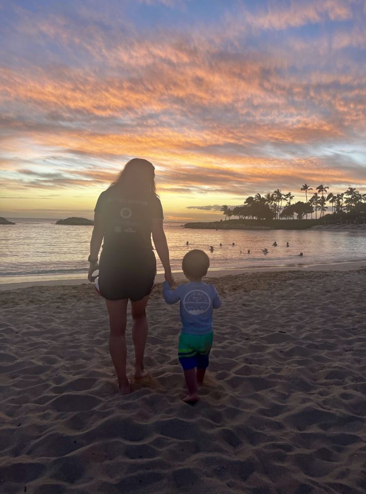 照片8-9: 太阳落下海平面,海浪逐拍着沙滩,外婆将宝宝的手轻轻挽,踩着薄暮走向余晖,留下两对脚印,而不是两对半,因为外婆没有拄拐杖:-)。