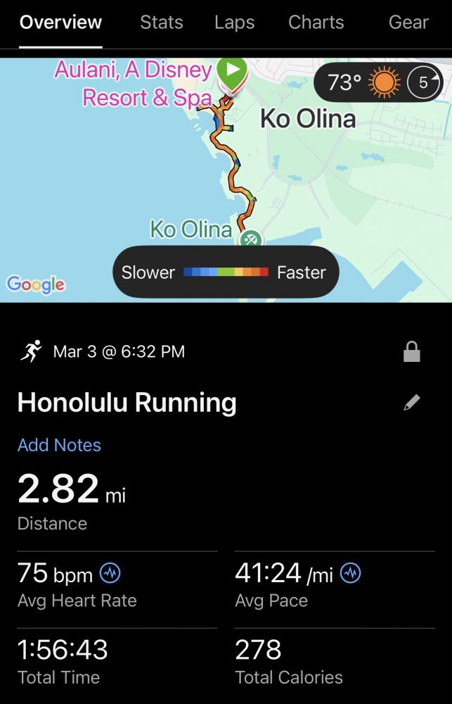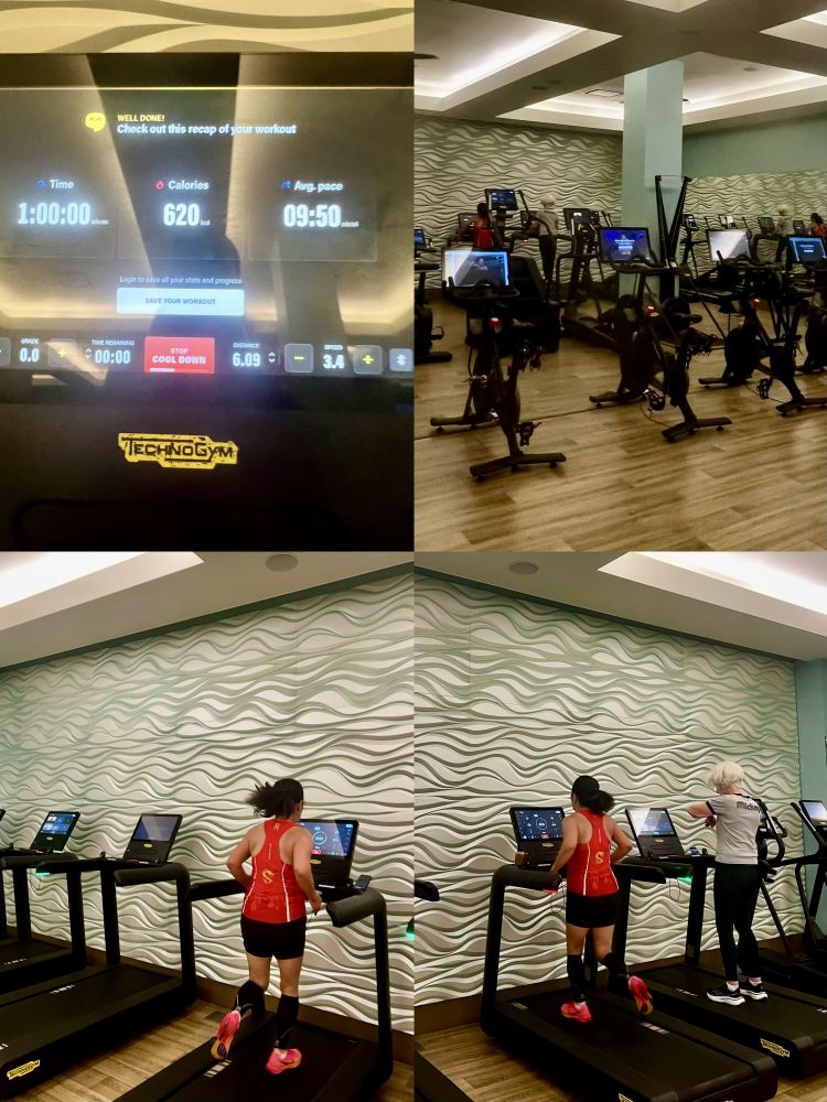 照片13: 在元宵节/情人节(周二)早晨8点半,宝宝外公和我前往迪士尼度假村的健身中心运动健身。宝宝外公象平时在家一样,在跑步机上跑了5英里(大约8公里),而我则跑了伦敦马拉松训练的60分钟轻松跑,大约6.1英里(约10公里)。这是我行程中的第二次跑步,大概率是仅有的两次跑步之一,非常开心能完成伦敦马拉松训练周计划的1/2,虽然50%完成率没有及格,但我很满意了,在旅途中跑步不易。宝宝外公先于完成跑步,他抓拍我跑步时,无意中拍到我的右侧有一位满头白发的女士矫健地在跑步机上快走;先生说从背后看,那位女士大约60多岁。