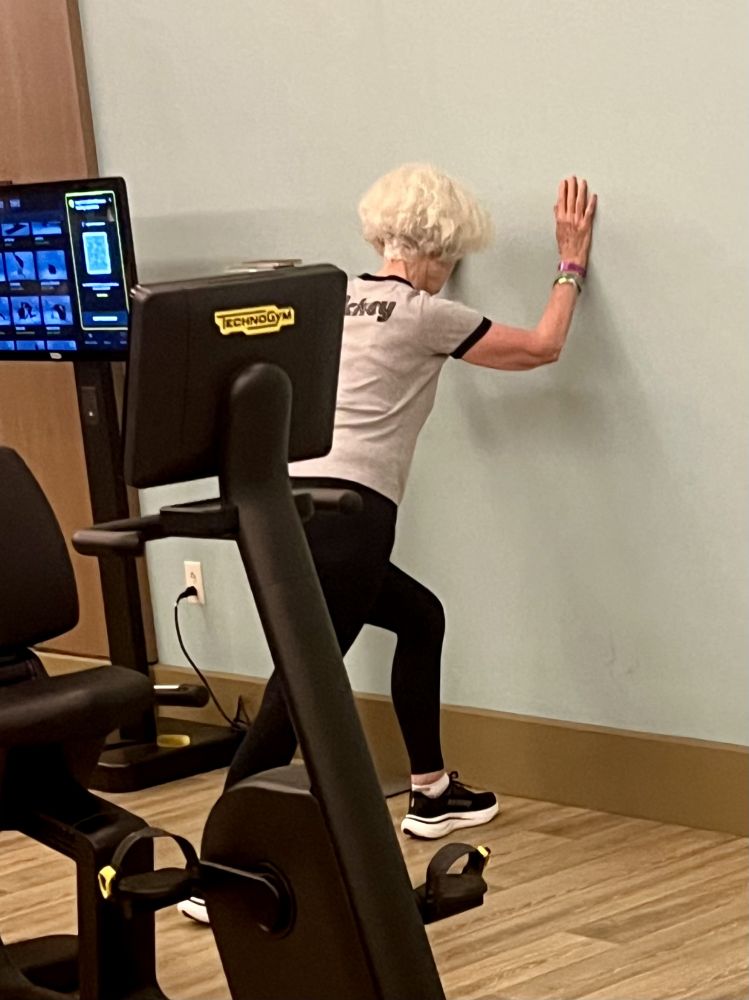 照片14: 我和那位女士前后相差1、2分钟Cool Down;看到她完成了拉伸,我上前主动与她打招呼,给她看了我们抓拍的照片中有她的背影,问她是否可以存留;并且,我询问她是不是长期坚持运动健身,保持这么好的身材。我的询问打开了她的话闸,她开心地感谢我赞扬她的健身以及对她感兴趣,对拍了她的照片没有异议,并且主动自我介绍说她的名字叫MJ,来自西雅图,曾经是一位软件开发工程师,如今是一位机器人训练工程师,今年80岁了,没有任何计划减缓工作强度。接着,她又说:“这一切不是我自己能干什么,而是上帝赐我健康的身体,包括体力和脑力的健康”。接着, ML问我:“你是日本人吗?”,我回答:“不是。我来自中国,上个世纪80年代后期到英国留学,毕业后到美国工作。”她讯速地说:“噢,你实际上离开中国快40年了。我有好几位中国朋友,他们来的比你晚”。。。。。。