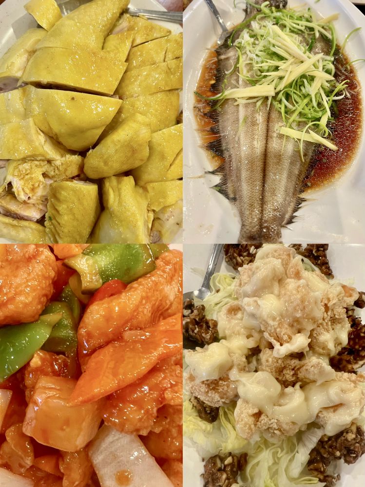 照片1-2: 感谢好友ZP/YJ夫妇点的丰盛午餐,包括贵妃鸡、清蒸鱼、酸甜鱼片、核桃仁大枣、铁板烧牛排、猪肉粉条、炖豆腐、蛋黄裹嫩豆腐,每一道菜都很好吃。