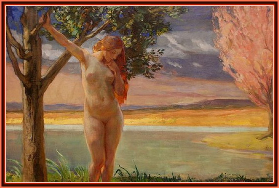 这是霍夫曼稍晚时又绘制的一幅《亚当与夏娃》的局部。亭亭玉立的夏娃陷入沉思,远处的天空、田野、树木以及夏娃的发梢都像火焰在燃烧。图中仅夏娃这部分就可以构成一幅完整的作品,亚当似乎可有可无。与其他印象派画家刻意与传统决裂不同,我们可以在画中看到霍夫曼结合了印象主义和古典主义的两种风格,是画面既有生命的跃动,又有田园诗般的静谧。