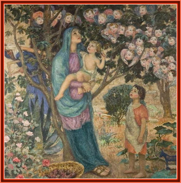 鲁伯特·巴尼(Rupert Bunny,1864–1947)是为澳大利亚画家,但他长期居住在Fin-de-Siècle时期的巴黎,属于象征主义画派。“The Morning Hymn”这幅作品描绘了《圣经·新约》中一个故事。罗马任命的犹太国王希罗德为保住自己的王位要杀死当地所有的男婴,为此圣母玛利亚和丈夫约瑟夫赶紧带着还是婴儿的耶稣避难埃及。后来他们听说希罗德死了,于是又返回了祖国耶路撒冷。这幅画正是表现了玛利亚返回故土时的愉悦心情,只见他怀抱耶稣,仰头看到树上的果实彷佛是唱诗班的一群可爱的孩子在歌颂明朗的清晨。约瑟夫只是树后的背景。站在玛利亚身旁的是尚未成年的施洗约翰(就是被莎乐美爱得死去活来,得不到心就要脑袋的那位),他身后有他的玩具木马。玛利亚脚下有一盘石榴。盛产于中东地区的石榴是经常出现在圣经故事里的果实,在这里象征玛利亚带着耶稣返回了耶路撒冷的家园。