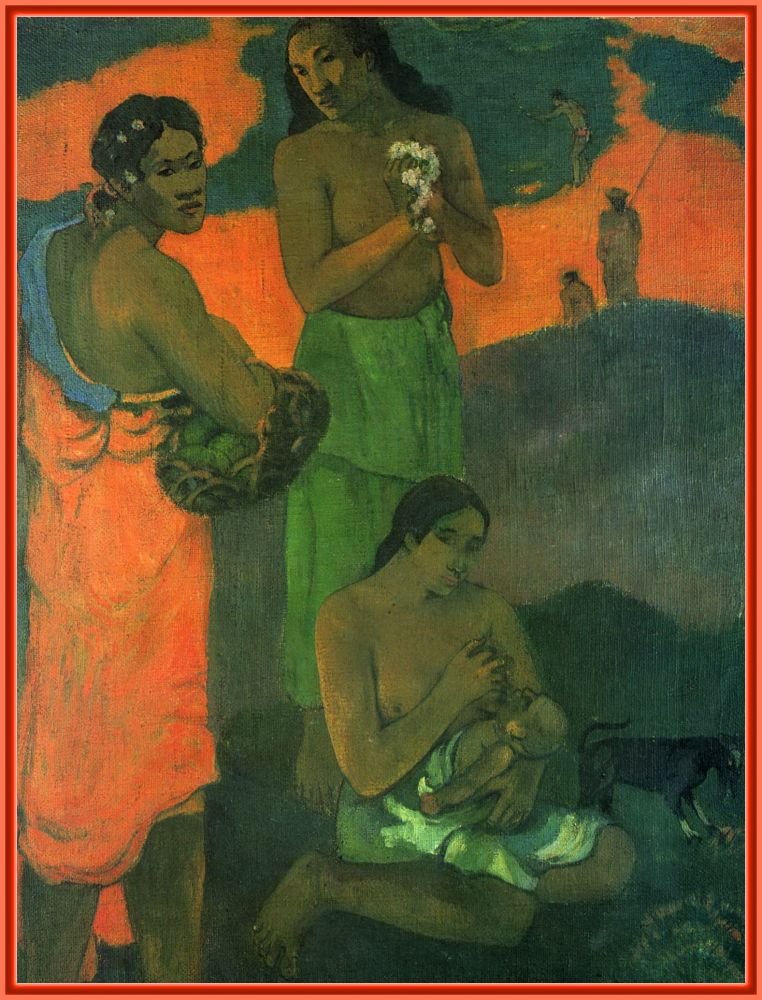 在如诗如梦的氛围中,一群土著女人或坐或立或卧,从嗷嗷待哺的婴儿到瑟缩在角落的耄耋老妇。没有一个男人存在,好像只有女人才能理解和回答那三个最根本的哲学问题。然而画面上的这些女人似乎没有一个对这些无聊问题有兴趣。好像高更在说:是他自己在自寻烦恼。