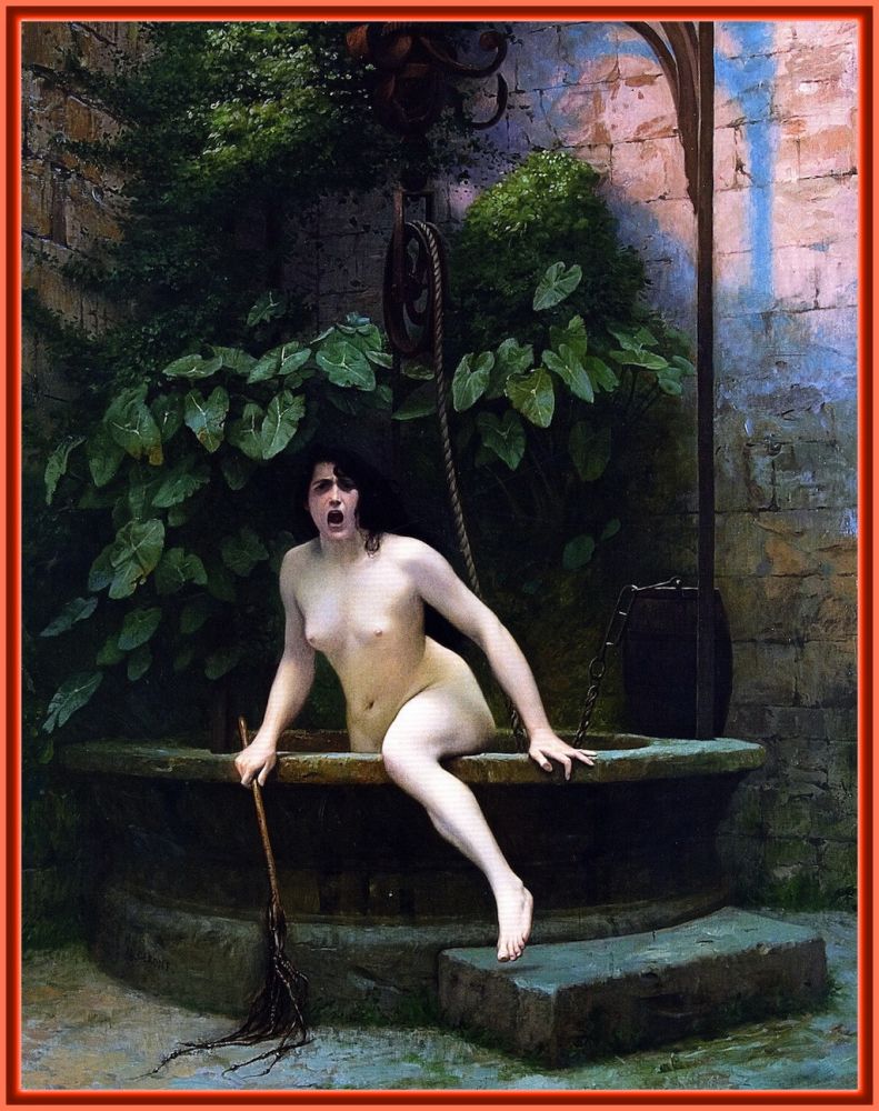 看来法国画家杰罗姆(Jean-Léon Gérôme,1824–1904)的女人与罗普斯的更厉害。在上期《被缚的女人》中我们曾重点介绍过杰罗姆。这幅画的灵感显然来自古希腊哲学家德谟克利特(Democritus,约460 BC–约370 BC)的名言: “真理藏在井底。“(Truth lies at the bottom of a well.)原来女人不但是魔鬼的化身,也还是真理的化身。世上谎言横行,害得“ 真理” 娘娘在地下也不得安生,于是怒不可遏,爬到世上来兴师问罪。手拿着鞭子要教训那些欠揍的臭男人。