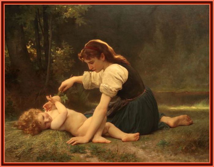 我们已经多次介绍法国学院派画家布格罗(William Bouguereau,1825–1905)的作品,与上几幅画作真是天壤之别。这幅画中一位年轻的母亲在静谧的林间逗弄她的婴儿。从她的服饰来看,是个整洁恭谨的农家姑娘。透过树丛的阳光给她的发梢染上一缕金色。田园诗般的一刻令人过目难忘。