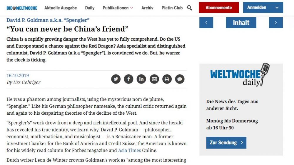 瑞士《世界周报》10月16日刊登了对美国哲学家、经济学家、数学家、乐评人大卫·保罗·戈德曼的采访。戈德曼是香港英语媒体《亚洲时报》的联合拥有者,时常以“斯宾格勒”为笔名对西方危机大声疾呼(其笔名取自《西方的没落》的作者奥斯瓦尔德·斯宾格勒)。荷兰作家莱昂·德温特认为戈德曼作品有意思的程度排在世界前列。