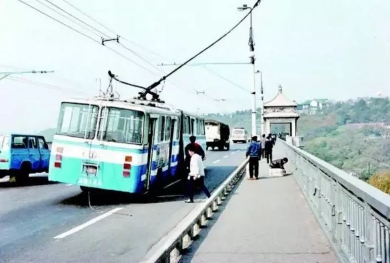 1993年,长江大桥上,“掉辫子”的1路电车。