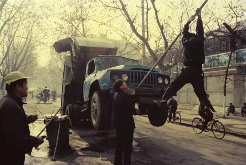 1994年,汉口万松园,司机试图扶正垃圾车。