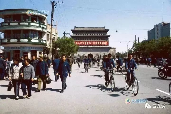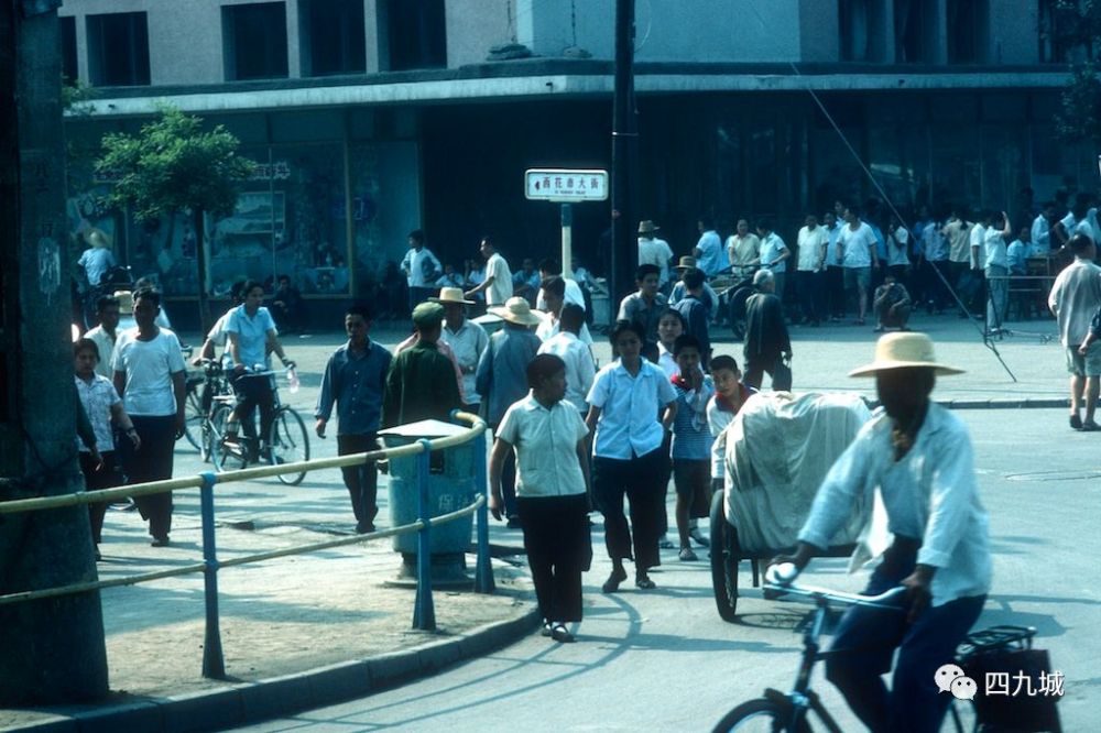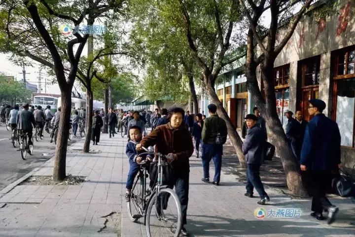 1979年5月,一条宽阔的人行道,两边有商店。下班时分,路上拥挤着的是公共汽车和自行车,还看不到小汽车,一位妈妈正推着后座上坐着孩子的自行车行走~