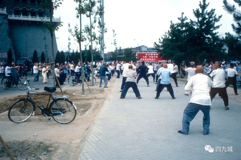 市民晨练中。沿着长安街,来到火车站附近,总是能看到市民早上做操、打太极。从这里再往前走,就是往通州走的路了。