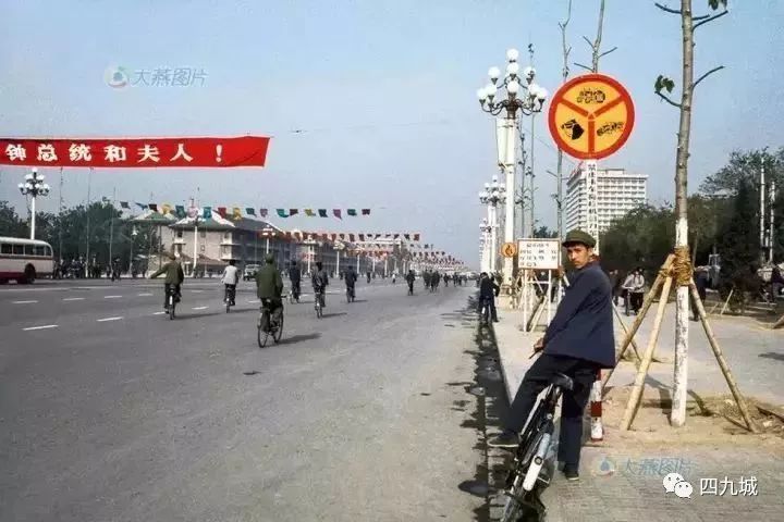 1977年4月,那时候,在东长安街上几乎看不到小汽车,几乎都是自行车。从照片上看悬挂着的欢迎标语,应该是有重要的外国首脑访华。