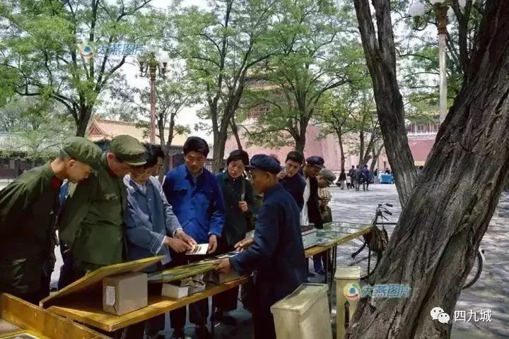 1977年5月,午门。这里是真正进入紫禁城的大门,沿线两侧是宽阔的自行车停车场,照片中呈现的是商贩在临时的流动柜台上,向游客出售导游图和明信片。