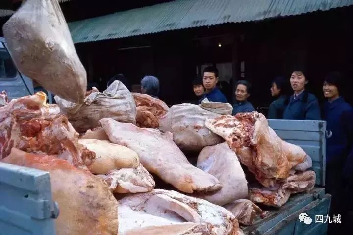 1977年5月,台基厂大街的副食店。这里以前是外国使馆区。裸露的卡车把冻猪肉运到副食店,没有任何卫生防护措施。顾客们从清晨就排队等候,尽管如此,猪肉还是实行配给制,没有肉票是买不到猪肉的,可见,想吃顿猪肉,是多么不容易~